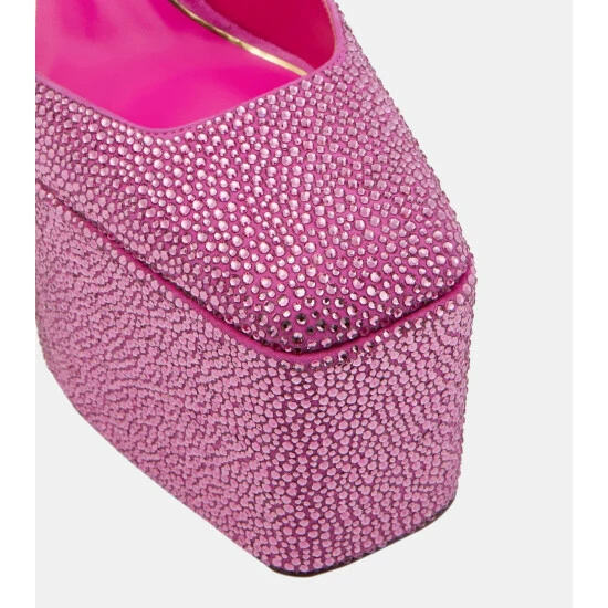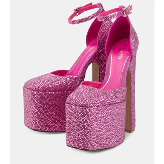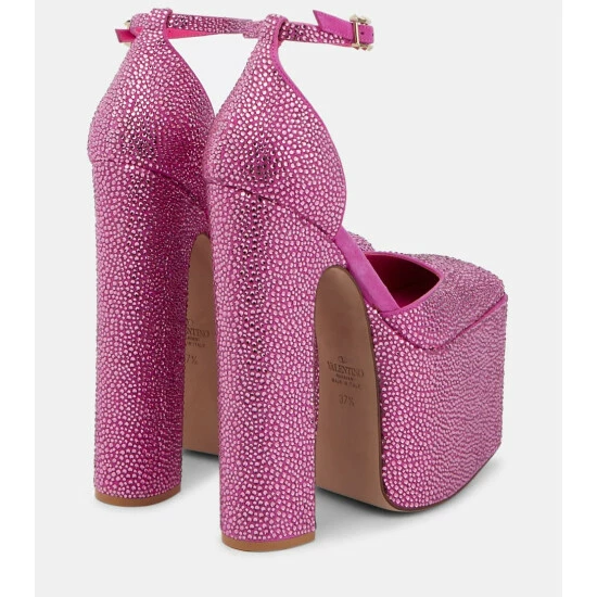 Reach soaring new sartorial heights in the sparkling vision of Valentino Garavani. The crystal-embellished Discobox pumps twinkle with all-over adornments and feature square toes, leather-covered platforms, and block heels.
