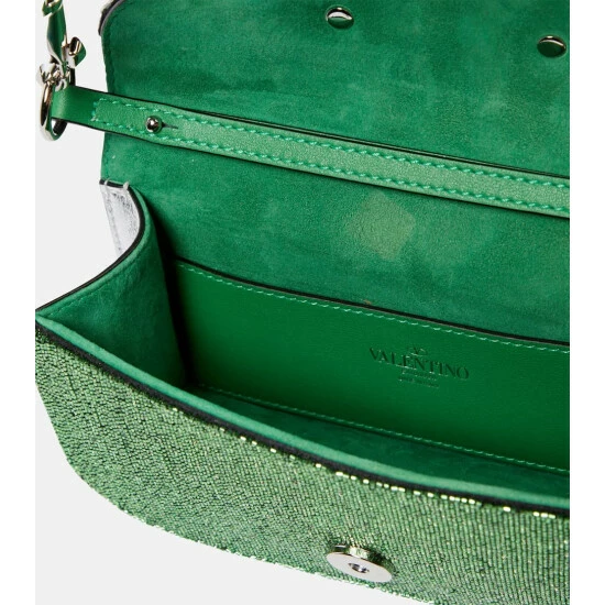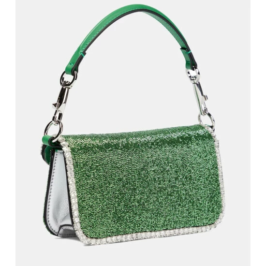 Designed for glamorous nights, the Locò bag from Valentino Garavani is cut from green leather covered with a shimmering layer of glass beads and trimmed in tonal square crystals. The compact baguette shape is finished with a gem-encrusted VLogo and features removable handle and chain shoulder strap for endless styling options.