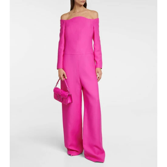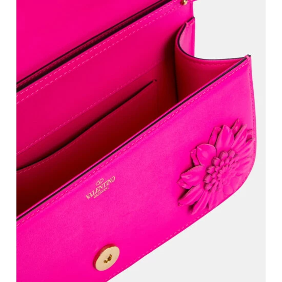 The Locò Small leather shoulder bag is made from leather in a shade of pink that is the center of Valentino’s latest collection. It is topped with a tonal Vlogo and floral embellishments.