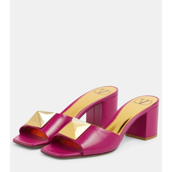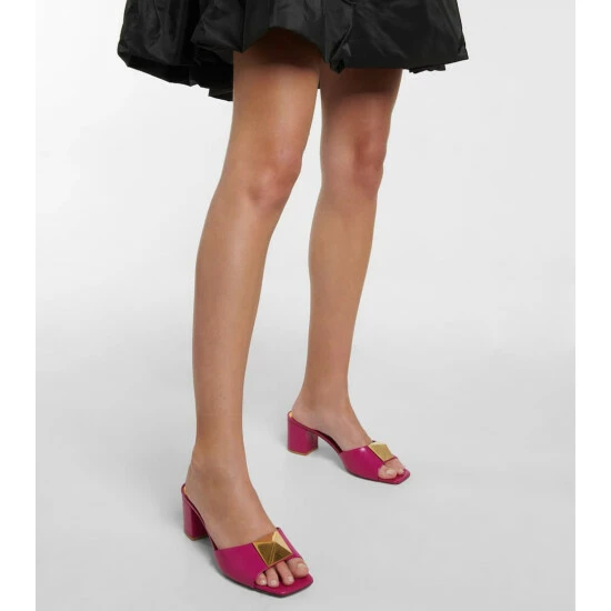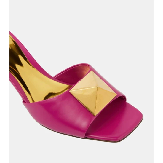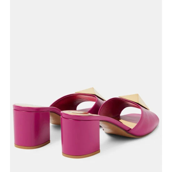 The One Stud mules from Valentino Garavani are defined by the magnified pyramidal studs adorning the wide straps. Made from pink leather, they have squared open toes and block heels.
