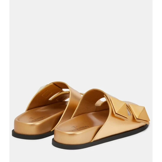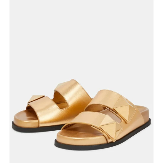 Valentino Garavani brings luxe glamour to these laid-back sandals with iconic pyramid studs in magnified proportions. Made from metallic leather, they have comfortable molded footbeds.