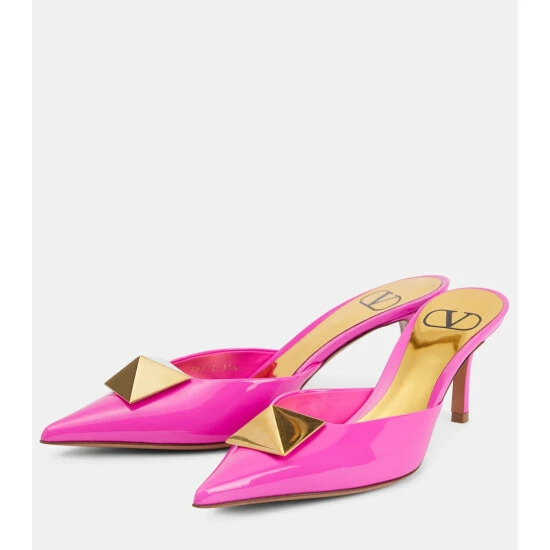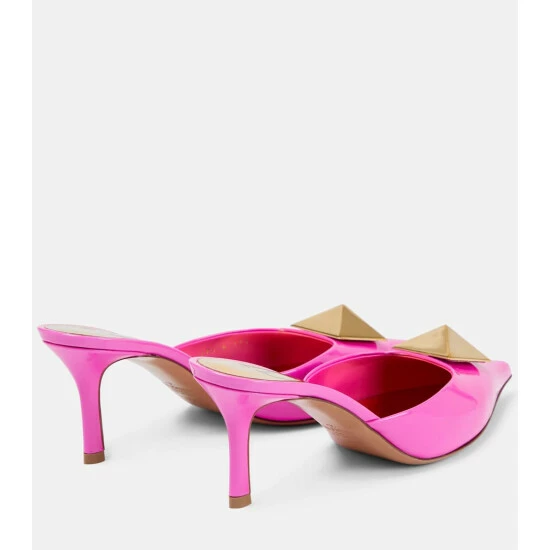 The One Stud mules are part of Valentino Garavani’s Pink PP collection, celebrating Pierpaolo Piccioli’s contemporary codes. Made from patent leather in Italy, this style is punctuated with signature pyramid studs on the pointed toes.