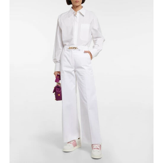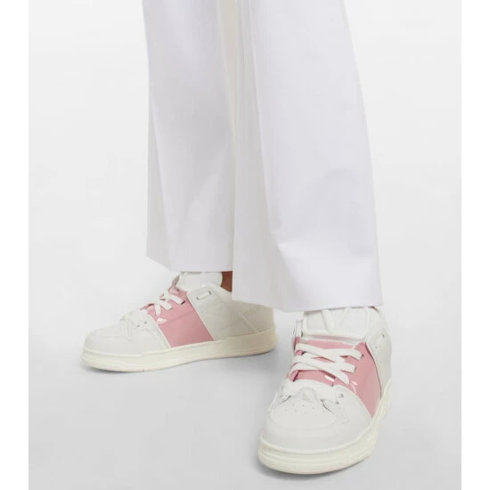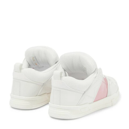 Valentino Garavani offers an elegant perspective on streetwear with the Open Skate sneakers. They are made from leather and feature pink patent leather paneling, and embossed logos.