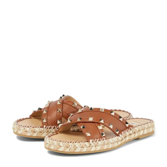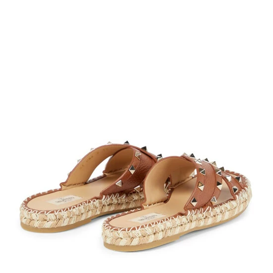 The Rockstud leather slides from Valentino Garavani are a summer essential. They are set on slightly elevated raffia-trimmed soles and feature grained leather crisis cross straps accented with golden Rockstuds.