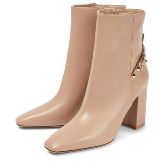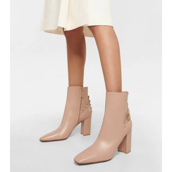 Valentino Garavani adds its signature tough-luxe touch to a wardrobe classic, adorning these ankle boots with Rockstud details. Made in Italy from beige leather, they’re set atop high block heels.