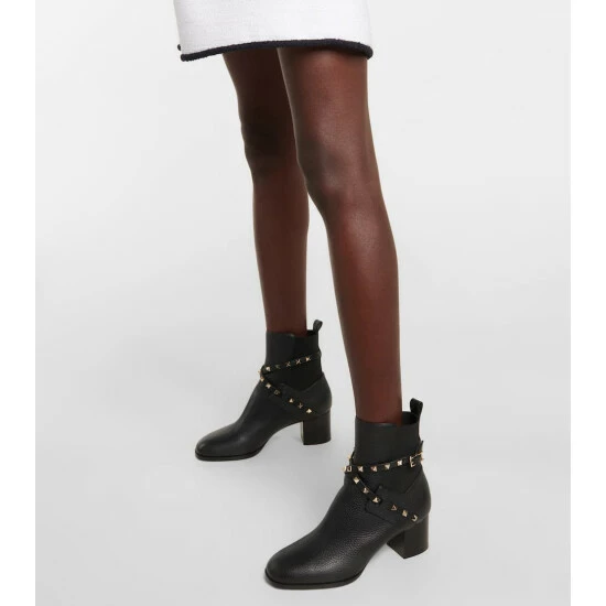 Valentino Garavani adds its signature tough-luxe touch to a wardrobe classic, adorning this pair of ankle boots with shimmering Rockstud details. Made from grained black leather with almond-toed profiles, theyโre set on block heels.