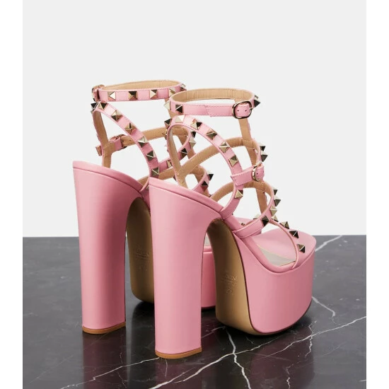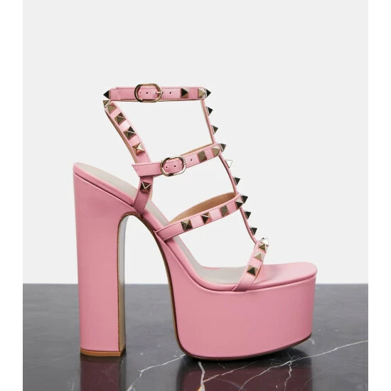 These sandals are the ultimate expression of your adoration for Valentino Garavani. Italian-made from smooth, pink leather, they feature towering block heels, platform soles, and brand-signature Rockstud hardware.