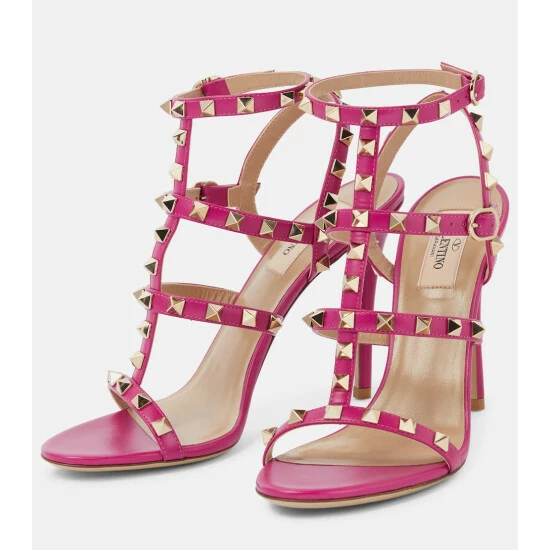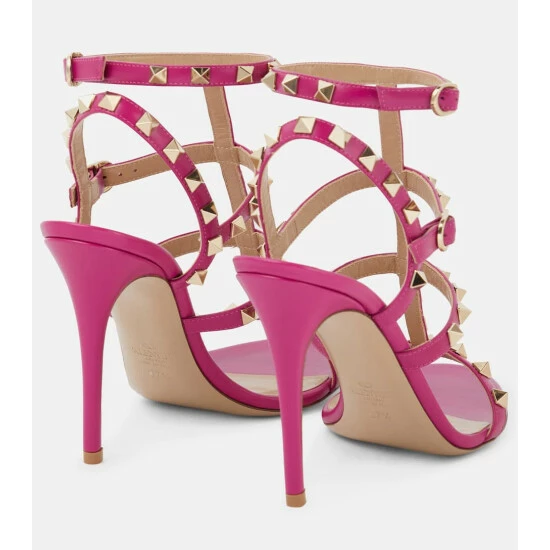Valentino Garavani’s iconic Rockstud embellishments adorn each strap of these sandals. The pink leather pair is ideal for parties and ladylike elegance β be sure to match your jewelry to the pale golden studs.