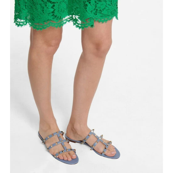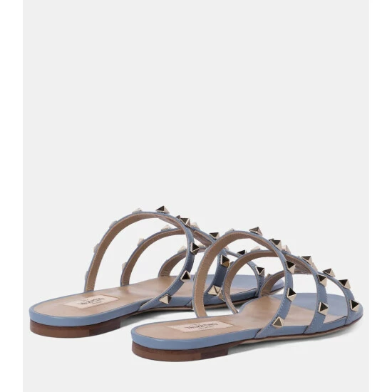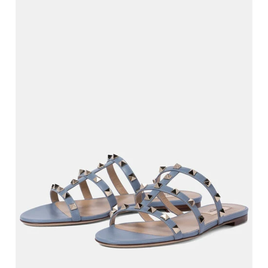 Embrace the fuss-free slide silhouette this season with Valentino Garavani’s Italian-made Rockstud leather style. Presented in blue leather for easy styling, they work a caged design, which is uplifted with gold-toned pyramid stud embellishments. Slip these sandals on with sunshine-ready ensembles.