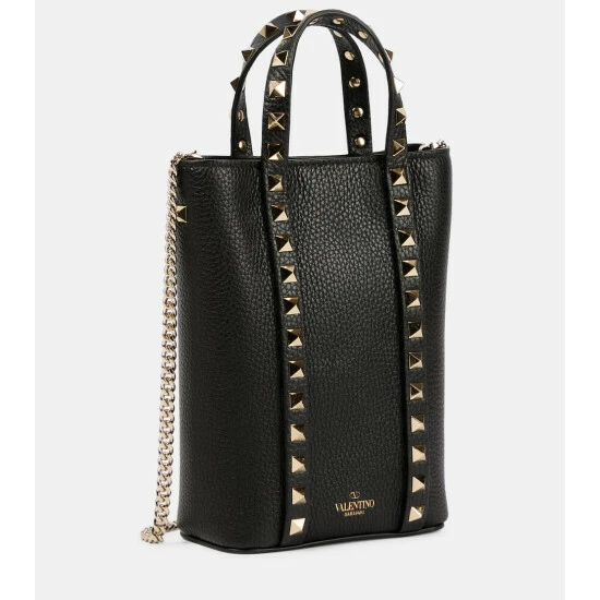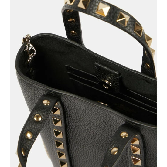 Rows of label-iconic platinum-plated Rockstud hardware mark this mini tote bag as a Valentino Garavani design. Made from grained calf leather in black, it features a detachable chainlink shoulder strap.