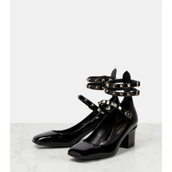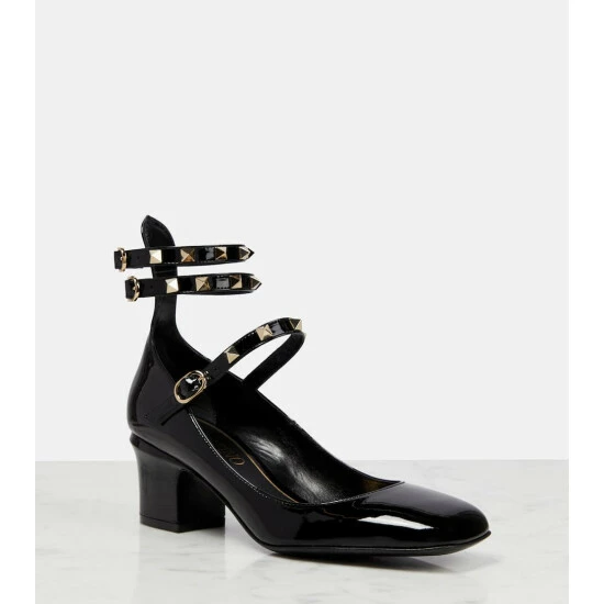 Valentino Garavani looked to ancient architecture to create the now-iconic Rockstud embellishments. These glossy patent leather pumps have an embellished caged construction, square toes, and block heels for an edgy finish.