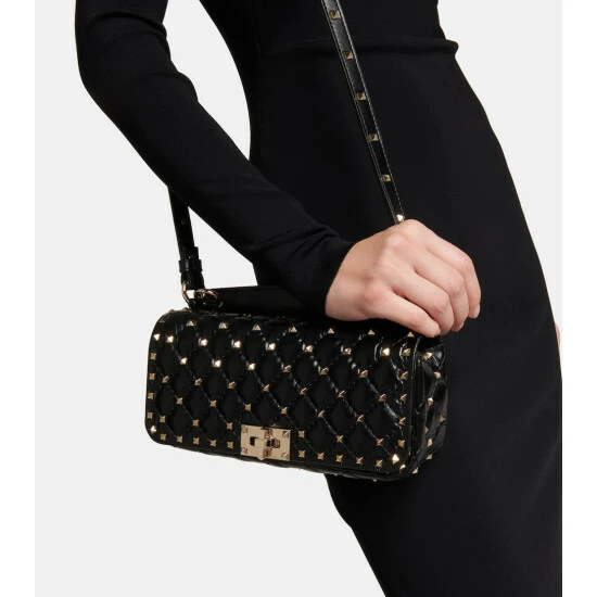 Valentino Garavani reworks the coveted Rockstud Spike shoulder bag in sumptuous nappa leather. Crafted in Italy, this black piece is adorned with the label’s signature platinum-toned stud embellishments and a chain shoulder strap.