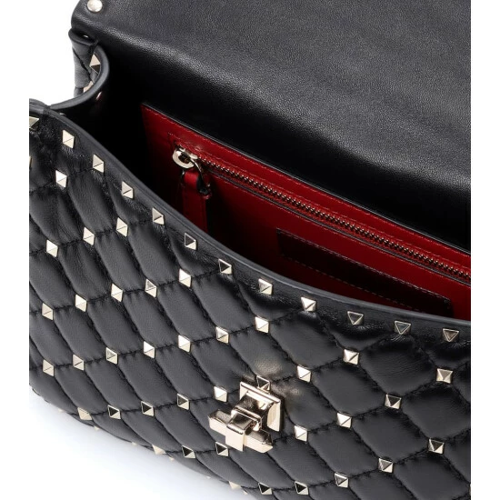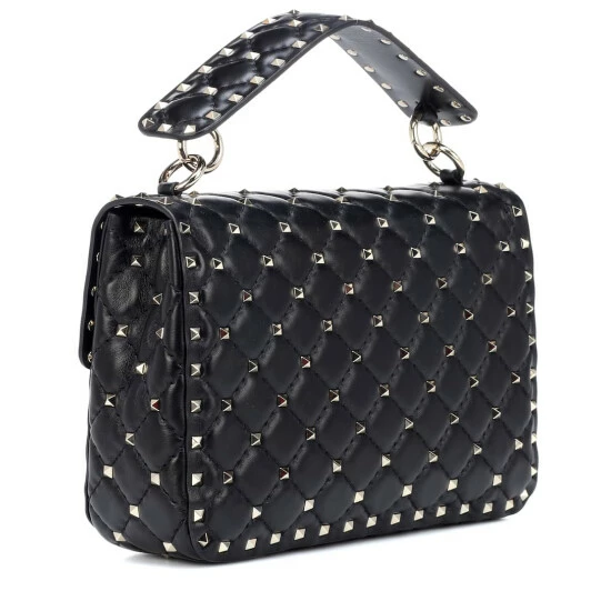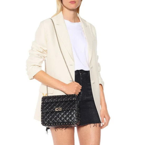 Opt for edgy elegance with this Rockstud Spike bag from Valentino Garavani with a detachable top handle and gleaming chain shoulder strap. Crafted from soft nappa lambskin leather, this black piece is accented by ruthenium-finish micro studding. Carry yours wearing a red midi dress to make a powerful chic impression.