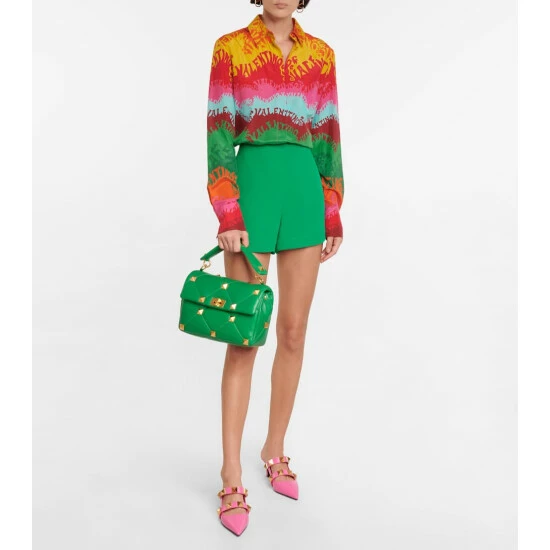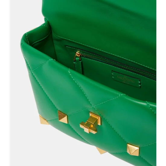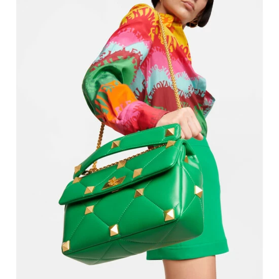 Valentino Garavani updates its iconic hardware on the new Roman Stud Large shoulder bag. The lines of the pyramidal details are elegantly mirrored by the diamond-quilted lamb leather, which comes in green. Make yours a glamorous plus-one for evenings out, or whenever you wish to make a statement.