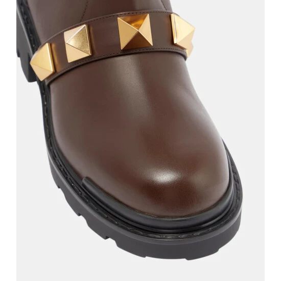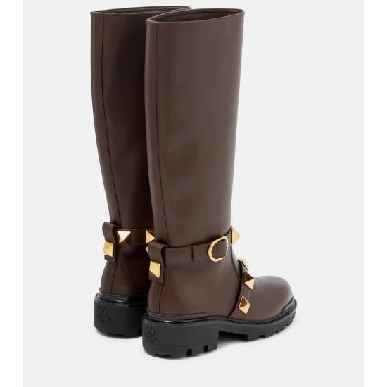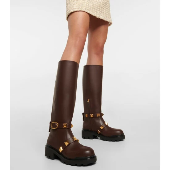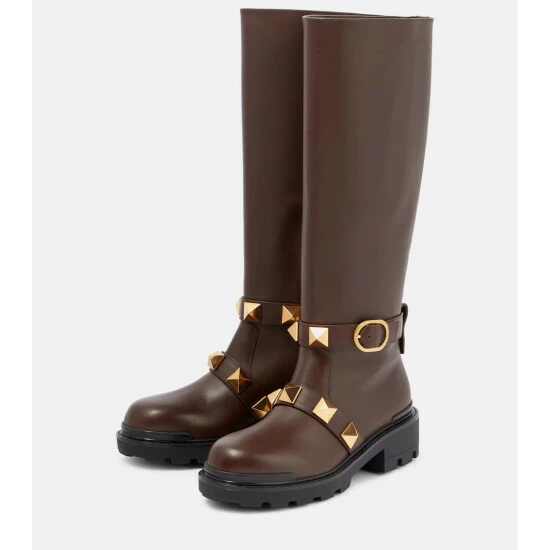 Opt for a tough-luxe approach to footwear with the Roman Stud leather knee-high boots from Valentino Garavani. Set on lugged rubber soles, the brown style is accented with buckles and signature plated studs.