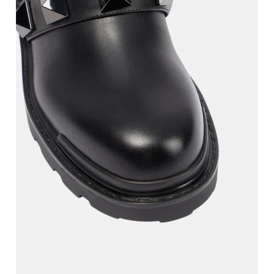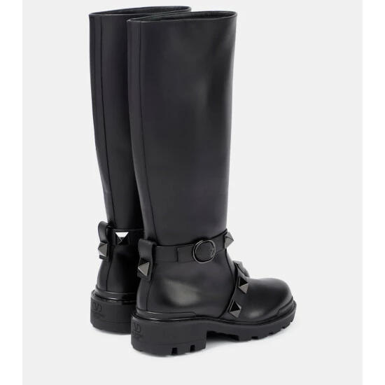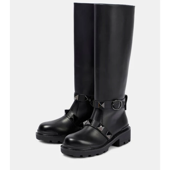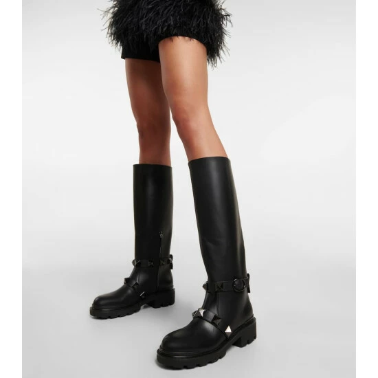 Opt for a tough-luxe approach to footwear with the Roman Stud leather knee-high boots from Valentino Garavani. Set on lugged rubber soles, the black style is accented with buckles and signature plated studs.