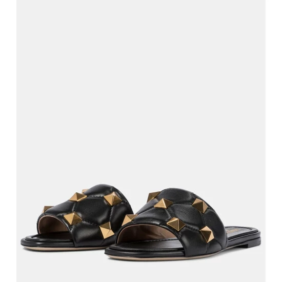 Slip into instant recognition this summer with Valentino Garavani’s Roman Stud slides. Made from black leather, this quilted design is punctuated with the enlarged versions of the iconic pyramid Rockstuds.