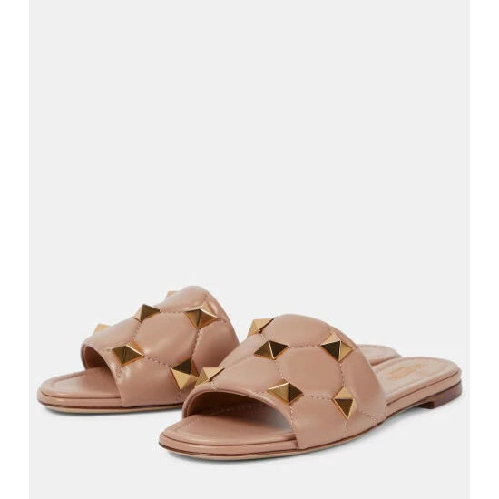 Slip into instant recognition this summer with Valentino Garavani’s Roman Stud slides. Made from pink leather, this quilted design is punctuated with the enlarged versions of the iconic pyramid Rockstuds.