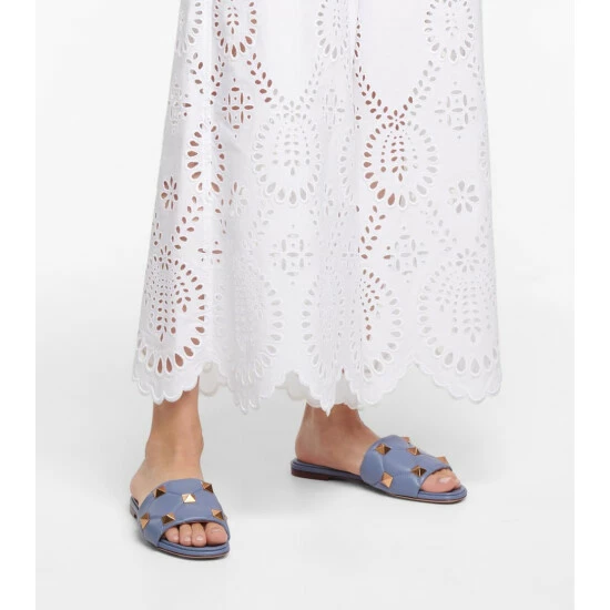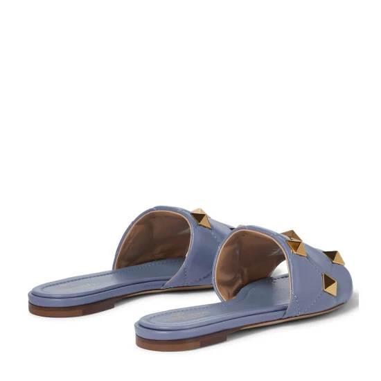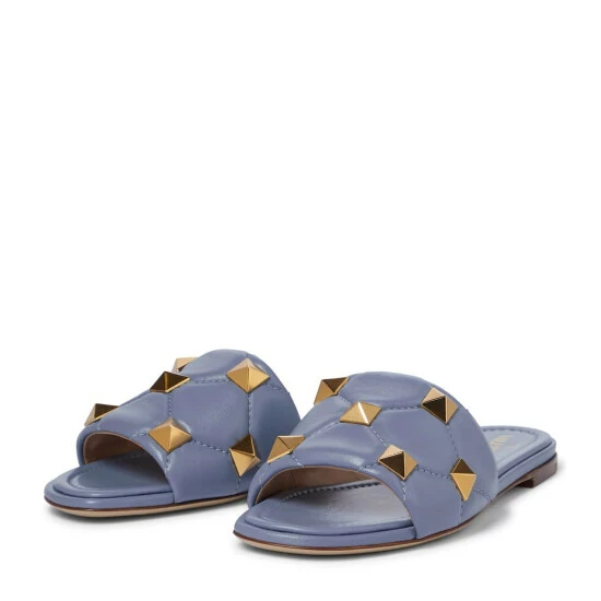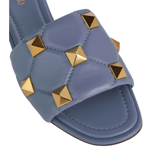 Slip into instant recognition this summer with Valentino Garavani’s studded slides. Made from pale blue nappa leather, this quilted design is punctuated with the enlarged versions of the iconic pyramid Rockstuds.
