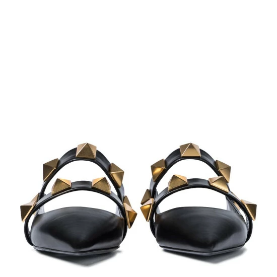 Fans of Valentino Garavani’s iconic hardware will adore the new Roman Studs that decorate these slippers. Made in Italy from smooth calf leather in classic black, these mule-inspired flats have pointed toes, padded insoles, and slender heels.