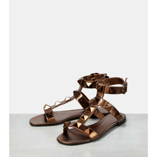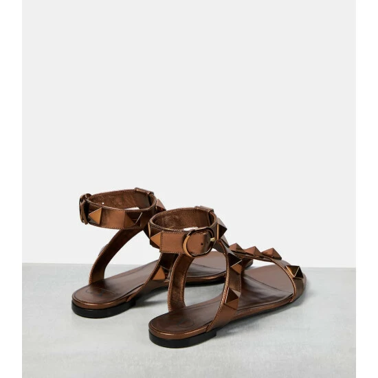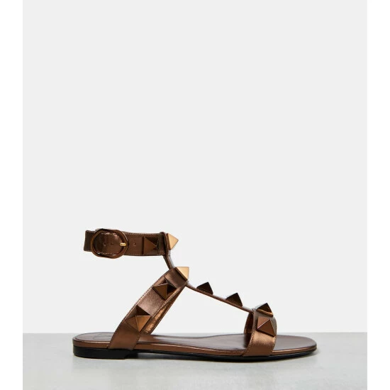 Turn to the Roman Stud sandals from Valentino Garavani for a statement warm-weather look. This bronze leather pair is elevated with buckled ankle straps and tonal pyramidal studs โ a signature of the brand.