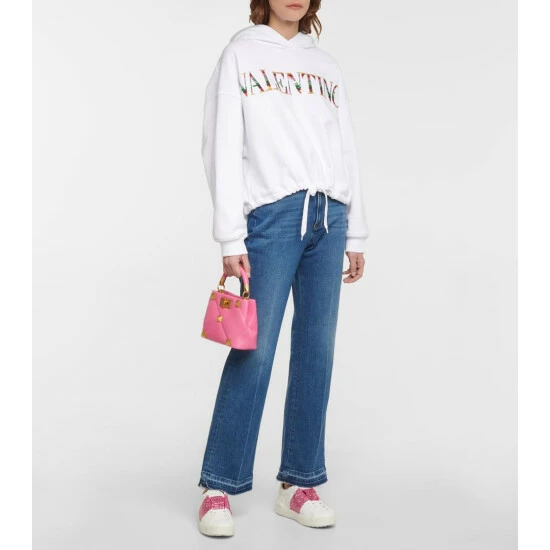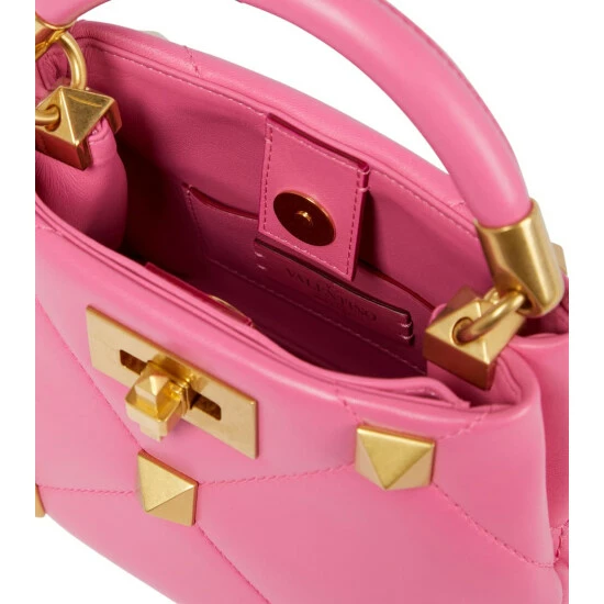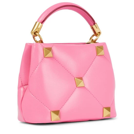 The Handle Mini tote features Valentino Garavani’s newly supersized Roman Stud hardware. The lines of the pyramidal details are elegantly mirrored by the diamond-quilted pink nappa leather.