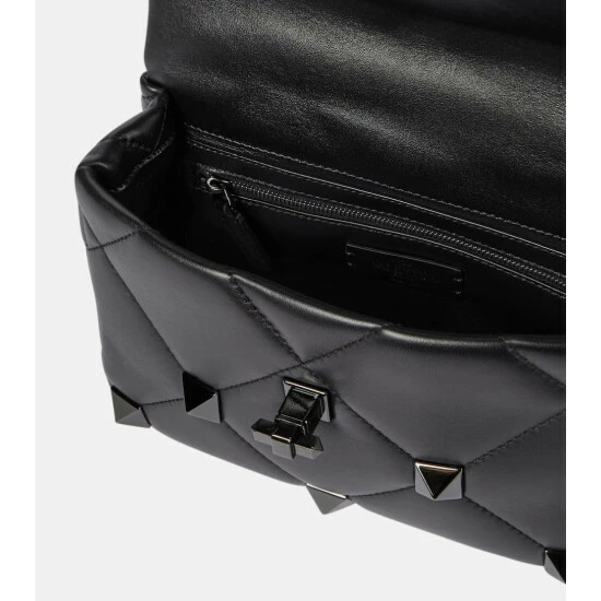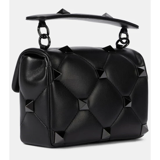 Look to Valentino Garavani for understated tough-luxe pieces like the Roman Stud The Shoulder bag. This top-handle silhouette is made from black quilted Nappa lambskin with tonal stud-embellishment and a tonal chainlink shoulder strap.