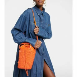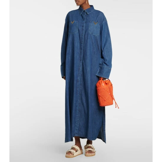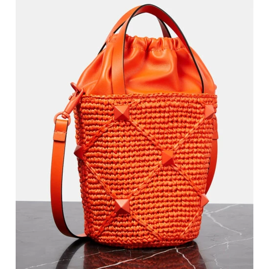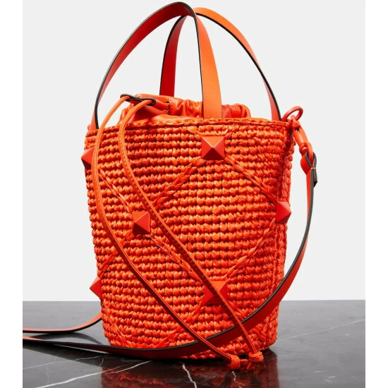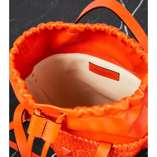 Valentino Garavani looked to ancient architecture to create the now-iconic stud embellishments. This tote bag has a woven structure with a leather drawstring pouch, twin top handles, and an adjustable shoulder strap.