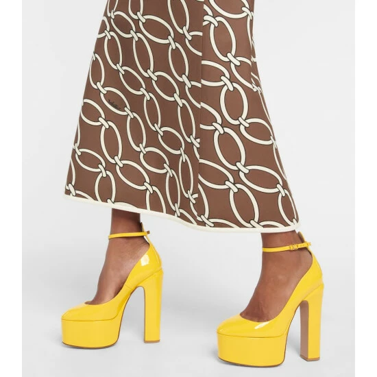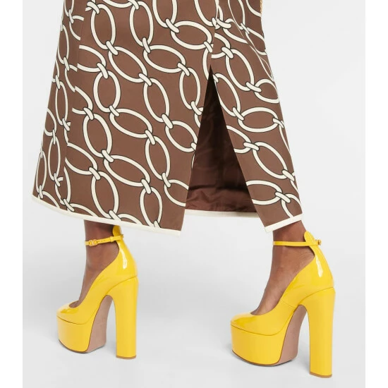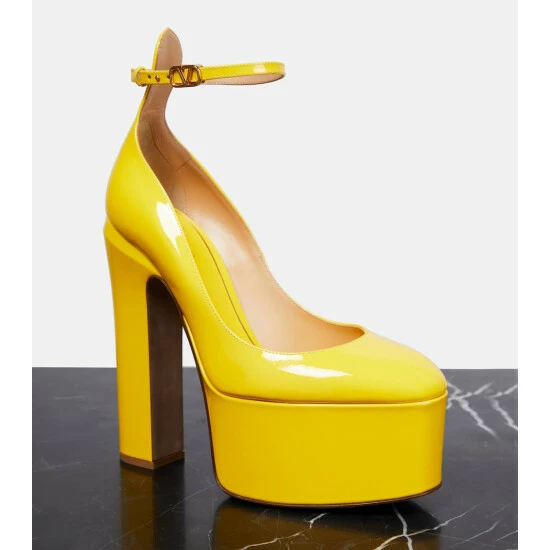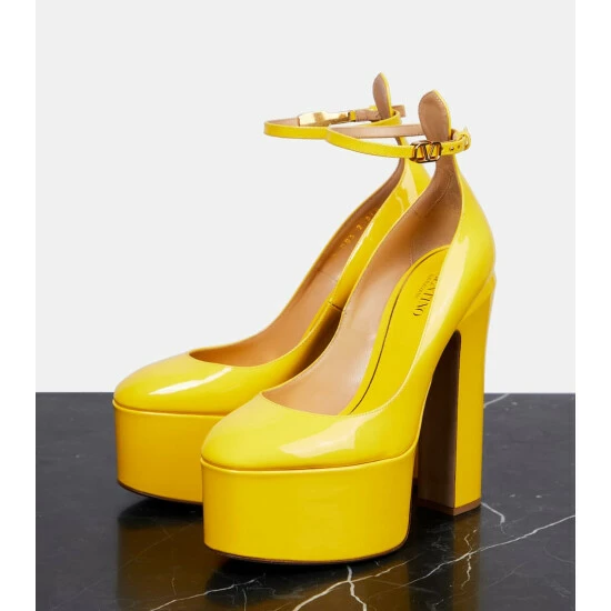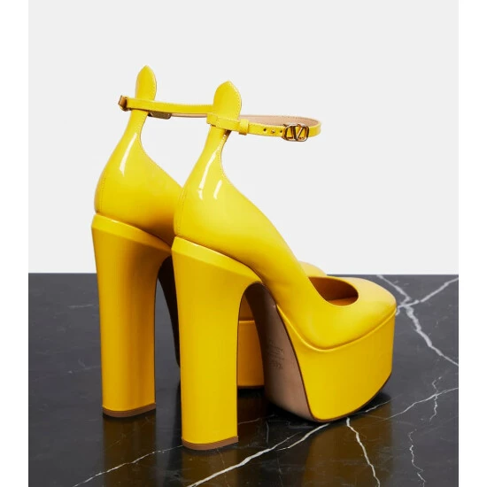 Dare to turn heads in Valentino Garavani’s Tan-Go patent leather pumps in lemon yellow. Made in Italy, they’re set atop towering 155mm platform heels, and feature signature VLogo buckles.