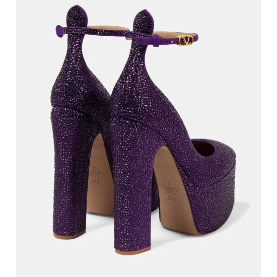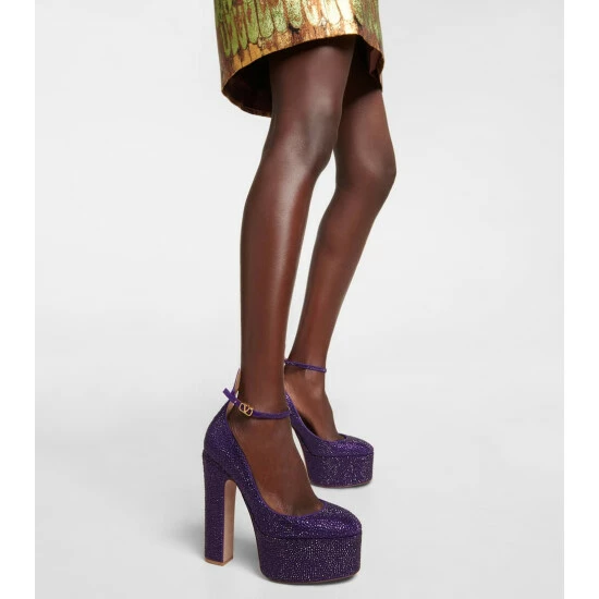 Take center stage wearing Valentino Garavani’s striking Tan-Go pumps. Made from crystal-embellished leather, they rest on staggering platforms and block heels, and fasten with dainty VLogo buckled ankle straps.