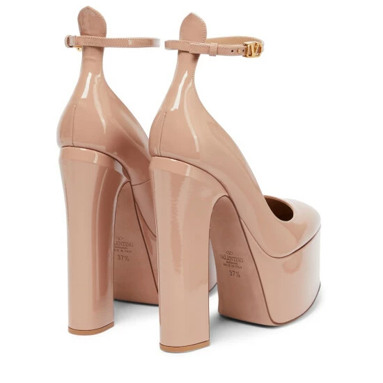 Elevate your footwear edit with these shiny Tan-Go platform pumps from Valentino Garavani. Crafted from rose pink patent leather, they’re set on sky-high platform heels and feature gold-toned VLogo buckles.