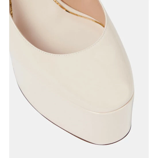 Cast in white, Valentino Garavani’s patent leather Tan-Go pumps are a statement piece. Made in Italy, this rounded-toe pair is topped with a thick heel, platform soles, and adjustable strap on the ankle.