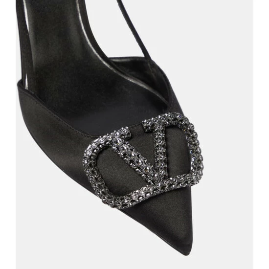 The embellished VLogo detail takes center stage on these satin Valentino Garavani pumps. Made in Italy, this style has pointed toes, leather soles, and caged straps.