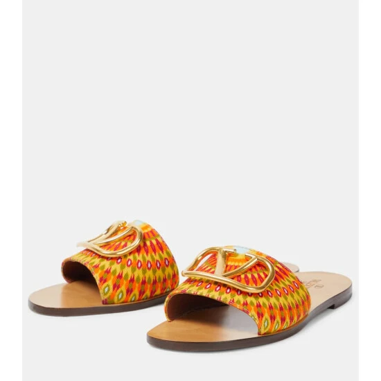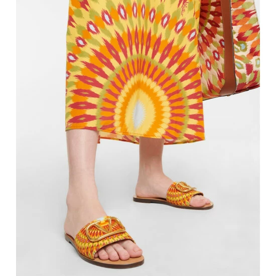 Elevate your summer footwear edit with these slides from Valentino Garavani x Mytheresa. Made from canvas with the Round Rain print and leather soles, this pair is finished with house-signature VLogo hardware. Wear yours with the matching tote and kaftan.