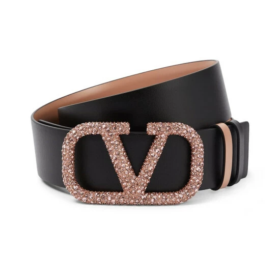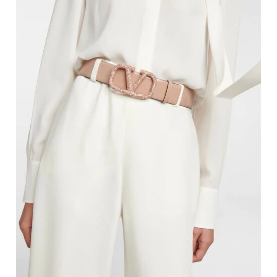 Add a glamorous touch to your ensembles with Valentino Garavani’s VLogo Signature belt. Made from calf leather, it reverses from black to rose and is accented with a VLogo buckle that’s dusted with Swarovski crystals.