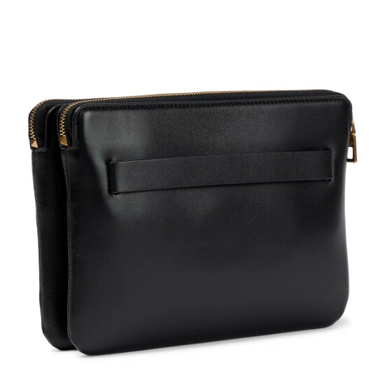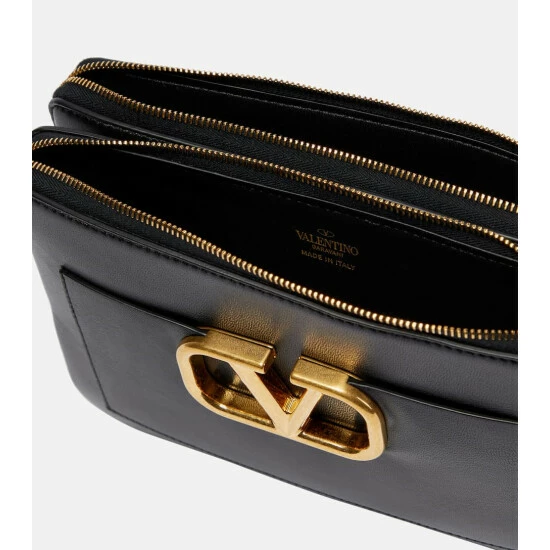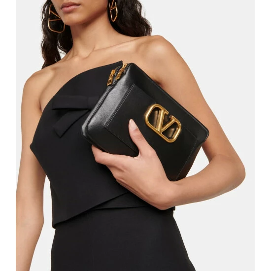 The VLogo Signature pouch from Valentino Garavani is adorned with the house’s emblem in an antique-brass finish. Made in Italy from black nappa leather, it has a squared shape and a zipped top.